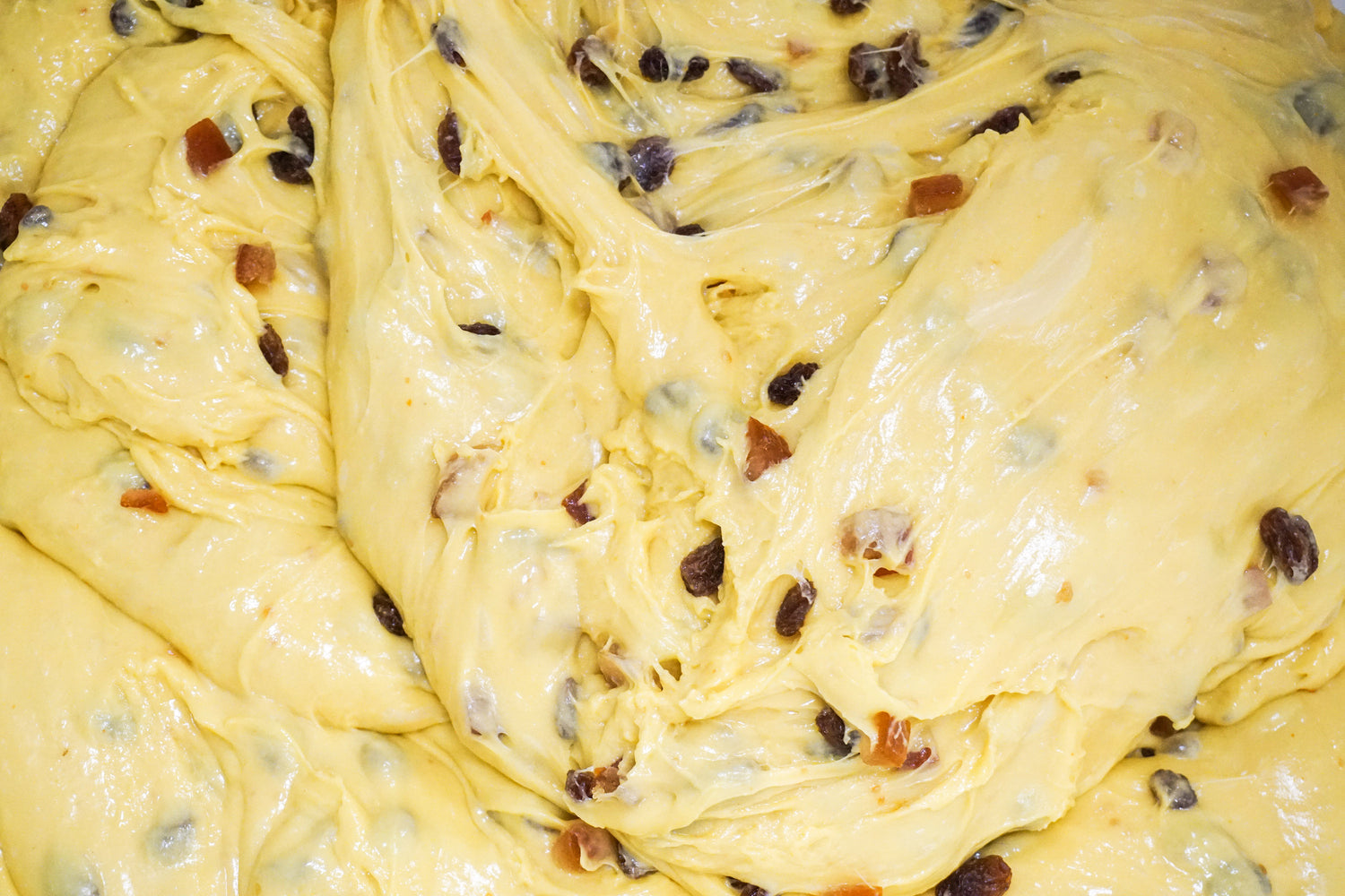L’impasto prende vita all’alba con il rinfresco del lievito madre, operazione effettuata ogni 3-4 ore per una successione di tre volte affinché il lievito inizi ad attivarsi. Il pre-impasto, ormai pronto, viene adagiato all’interno delle forme e poi collocato in camera di lievitazione per un totale di 12 ore.